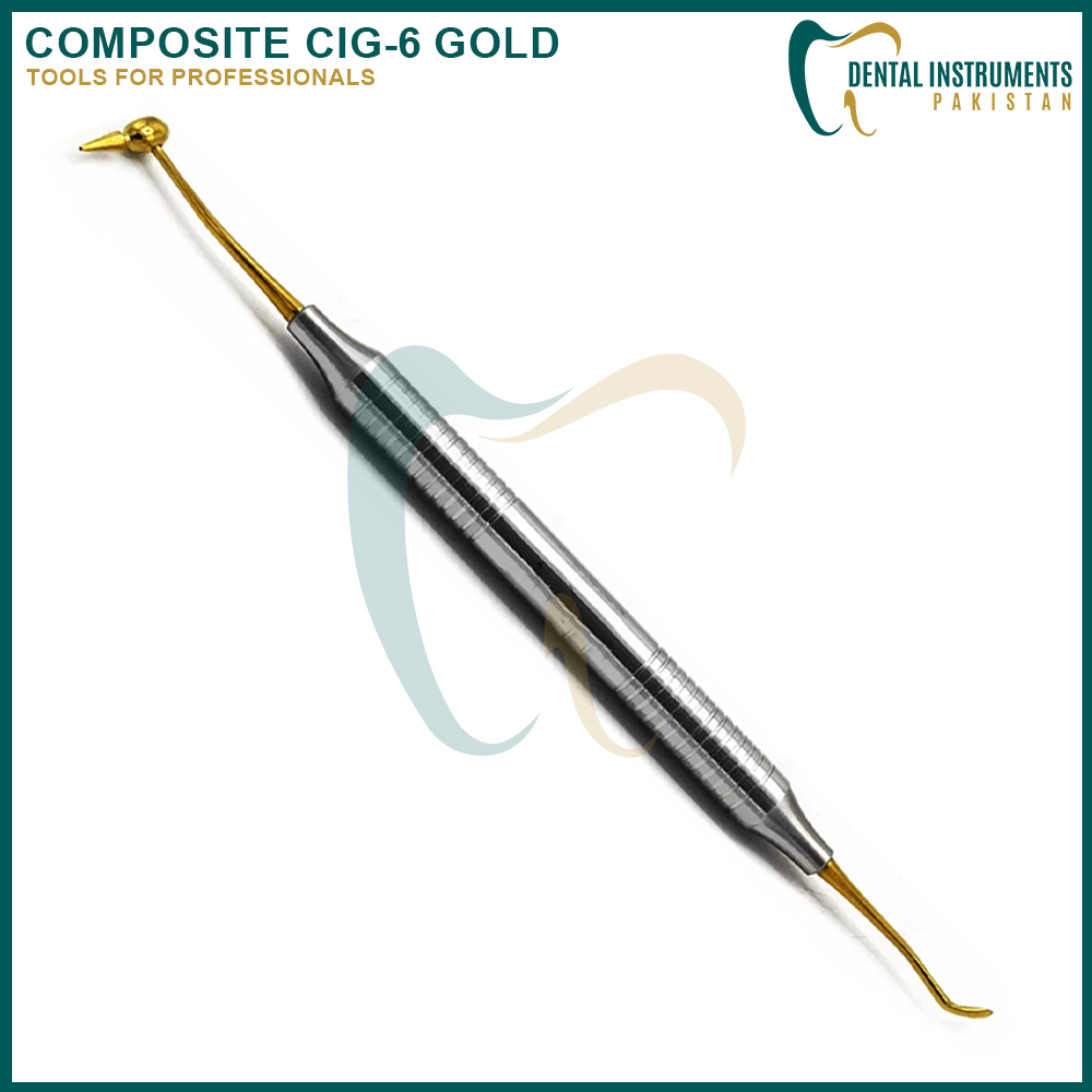 The Composite CIG-6 (Gold) is a premium, dual-ended dental instrument designed for the precise placement, shaping, and contouring of composite materials in restorative procedures. Coated with gold titanium nitride, this tool offers exceptional non-stick performance, reducing composite drag and ensuring clean, smooth restorations.