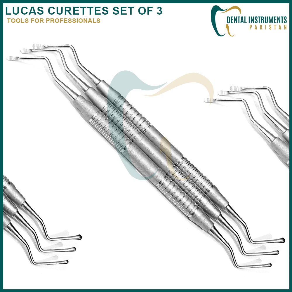 Lucas Curettes Set of 3 is a comprehensive surgical instrument set designed for effective soft tissue curettage, cyst removal, and socket debridement in oral and periodontal procedures. Each curette features a spoon-shaped working end tailored for precision and efficiency, allowing clinicians to access various anatomical areas with ease.