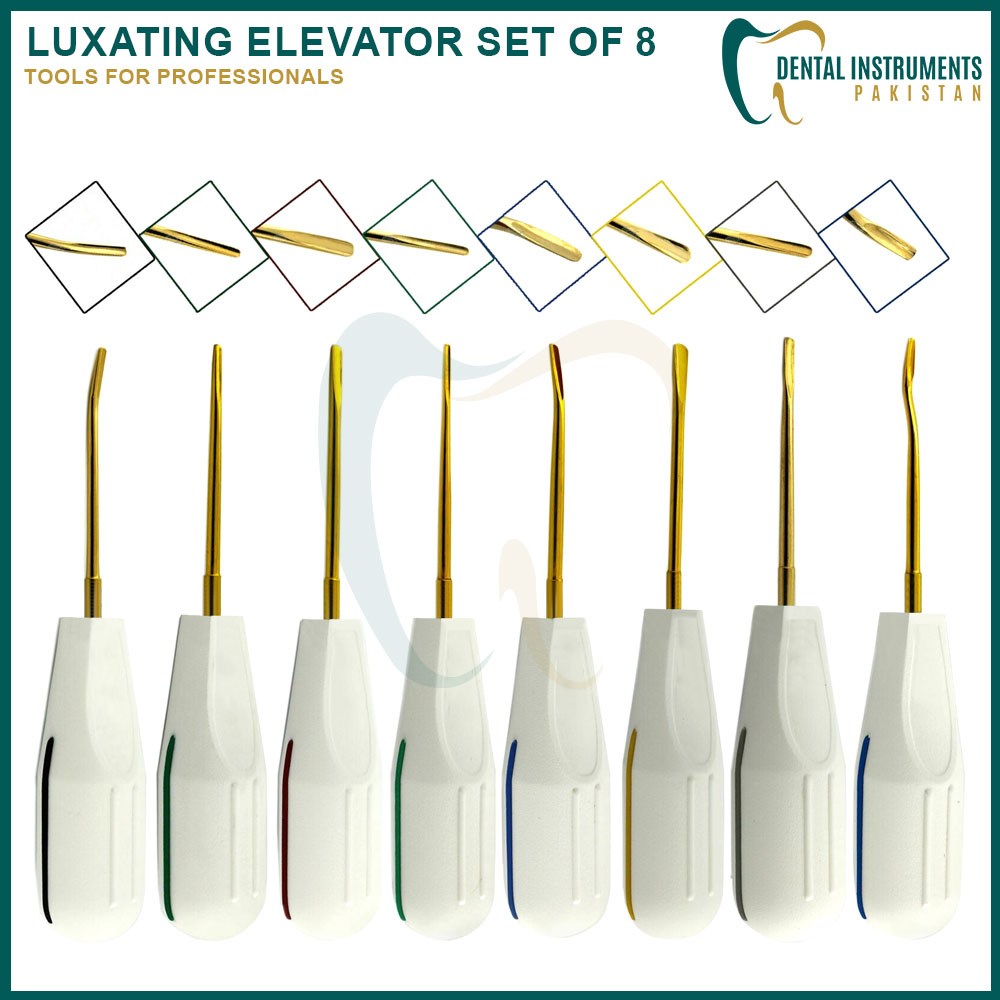 The Luxating Elevator Set of 8 (Gold Coated) is a premium collection of dental extraction instruments designed to provide exceptional precision and efficiency in luxation and tooth removal procedures. Each elevator features a durable gold titanium nitride coating, enhancing hardness, corrosion resistance, and non-stick performance.